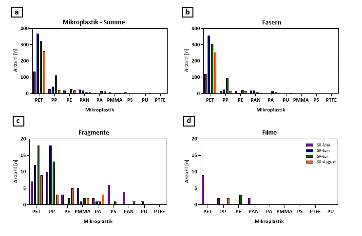 Für Österreich wurden 97,5% Proben analysiert (39/40). Die häufigsten Mikroplastik-Arten entsprechen denen aus Europa, mit geringer Variabilität in der Reihenfolge ihres Auftretens (Abbildung 3): Polyester (PET) gefolgt von Polypropylen (PP), Polyethylen (PE) und Polyacrylonitril (PAN). Fasern machen einen Großteil der Gesamtsumme aus, bei denen PET klar dominiert. Die Fasern stammen wahrscheinlich von synthetischen Textilien (z.B. Polyesterkleidung), die beim Waschen Mikrofasern freisetzen. Dies deckt sich mit typischen Faserquellen aus der Textilindustrie und Haushaltsabwässern. Fragmente entstehen durch mechanischen Abbau von Kunststoffobjekten, wie Verpackungen oder Konsumartikeln. Hier sind PET, PP und PE am häufigsten vertreten, jedoch in geringerer Anzahl als bei Fasern. Die Filme zeigen einen relativ geringen Anteil an Mikroplastik, mit PET und PP als Hauptvertreter. Kunststofffolien (z.B. Verpackungsmaterialien, Agrarfolien) sind die häufigste Quelle für diesen Typ Mikroplastik. Die Verteilung über die Monate zeigt, dass PET und PP konstant präsent sind, was auf kontinuierliche Einträge aus denselben Quellen aus Alltagsprodukten hindeutet (wie Textilien und Verpackungen). Auch zum Thema Mikroplastik braucht es mehr Vergleichsdaten für dieselben Zeiträume, um genauere Aussagen zu treffen, dennoch zeigen die Erhebungen der INSIGNIA-EU Studie wie allgegenwärtig Mikroplastik-Partikel in unserer Umwelt zu finden sind.